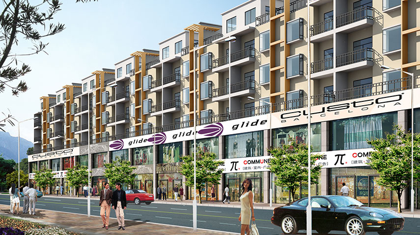 規(guī)模沿廈門(mén)路(小區(qū)西面)、建設(shè)路(小區(qū)南面)臨街布置商務(wù)住宅區(qū),在考慮經(jīng)濟(jì)和景觀的基礎(chǔ)上布置為一連排的底商住宅(5+1F),建筑色彩時(shí)快、同周邊城市環(huán)境及城市構(gòu)造結(jié)合密切。利用二層套空空商花園設(shè)計(jì),即解決了底層商業(yè)氛圍營(yíng)造之需,又為行為提供了人性化的遮陽(yáng)避雨棚;同時(shí),空中花園又為街道增添了一條數(shù)百米長(zhǎng)的空中綠化走廊,豐富了城市景觀,為商業(yè)環(huán)境注入優(yōu)雅的元素;底層商鋪采用10㎜厚大幅落地玻璃,深灰色時(shí)尚的落地玻璃門(mén);由專(zhuān)業(yè)商業(yè)經(jīng)營(yíng)機(jī)構(gòu)介入的規(guī)范管理,一個(gè)高尚繁華的商業(yè)格局就此形成,升值空間成為“無(wú)限可能”.....