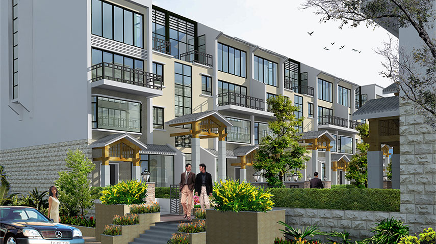 在總體布局上,花園社區(qū)內(nèi)住宅全部采用單元式直排布置手法有利于高效利用土地,戶(hù)甘道路將小區(qū)有機(jī)的分隔為相對(duì)獨(dú)立的組團(tuán)。小區(qū)住宅建筑主要由花園洋房(4+1 F)、多層(5+1F)、別墅、電梯公寓(11+1)組成,花園洋房約占75%左右?;▓@洋房底層住戶(hù)均設(shè)有花園,上層住戶(hù)設(shè)有花園露臺(tái),加大居住者與室外環(huán)境的接觸面,為住戶(hù)提供了良好的居住環(huán)境,內(nèi)部空間構(gòu)造為復(fù)式,在內(nèi)部空間的布置上為各種不同需求的居住者提供了豐富多樣的戶(hù)型和建筑面積,戶(hù)型建筑面積從220-300㎡;多層住宅的面積從120-170㎡,別墅面積360㎡。整體設(shè)計(jì)為新古典主義風(fēng)格,小車(chē)直接入戶(hù),前后庭均設(shè)花園,通過(guò)外廊與親水走廊將別墅外景自然過(guò)渡到室內(nèi),建筑形式美首先體現(xiàn)在內(nèi)部空間的合理表現(xiàn)上,也蘊(yùn)含于完美比例的推敲和細(xì)部的雕琢上,在高度的比例,色彩的控制、屋頂尺度中創(chuàng)造一種基本建筑意象。電梯公寓建筑面積從92-125㎡,整體建筑力求簡(jiǎn)潔統(tǒng)一,含蓄而不張揚(yáng),把現(xiàn)代主義的空透開(kāi)暢的美學(xué)特征同一種更為傳統(tǒng)的背景編制在一起,努力把建筑風(fēng)格與城市構(gòu)造結(jié)合起來(lái)。創(chuàng)造一種真正富有感染力、優(yōu)雅高貴的形象。