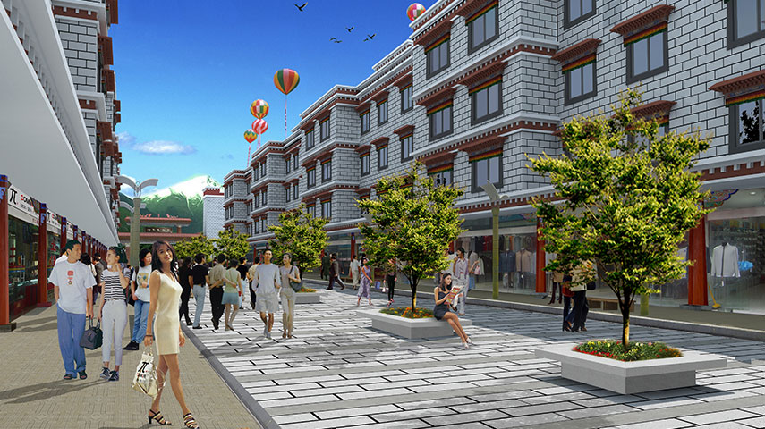 作為“嘉龍花園”開(kāi)發(fā)項(xiàng)目中最具特色的子項(xiàng)目,為打造一條富有藏民族神韻的、展現(xiàn)原生態(tài)魅力的步行街,規(guī)劃設(shè)計(jì)采用大量藏式民居的建筑符號(hào),在建筑材料的使用上,全部選用西藏當(dāng)?shù)夭牧?,以現(xiàn)代建筑語(yǔ)言加以詮釋。經(jīng)反復(fù)論證,確定步行街入口由一組體量雄偉、彩飾華麗、造型質(zhì)樸的藏式牌坊、碉樓組成,充分體現(xiàn)藏民族悠久的歷史、燦爛的文化、精美的工藝;街道兩側(cè)商鋪、住宅(4+1 F)完全采用藏民族的傳統(tǒng)手法裝飾;步行街路面、行人休息座椅材質(zhì)以花崗石為主,以綠色植物、花壇等為其色彩綴飾,色調(diào)組合內(nèi)斂然張力十足;所有街景小品、燈飾、Parking等均著力表現(xiàn)藏民族的日常生活片段,竭力將藏民族最純粹的民風(fēng)、民俗一一展現(xiàn),創(chuàng)造出具有歷史文化傳承、鮮明時(shí)代特點(diǎn)的民族風(fēng)俗街。
